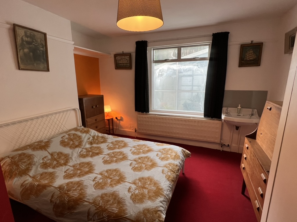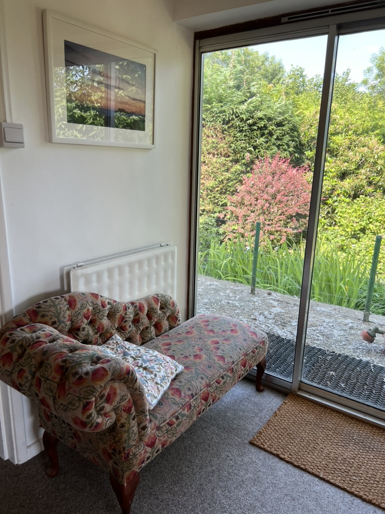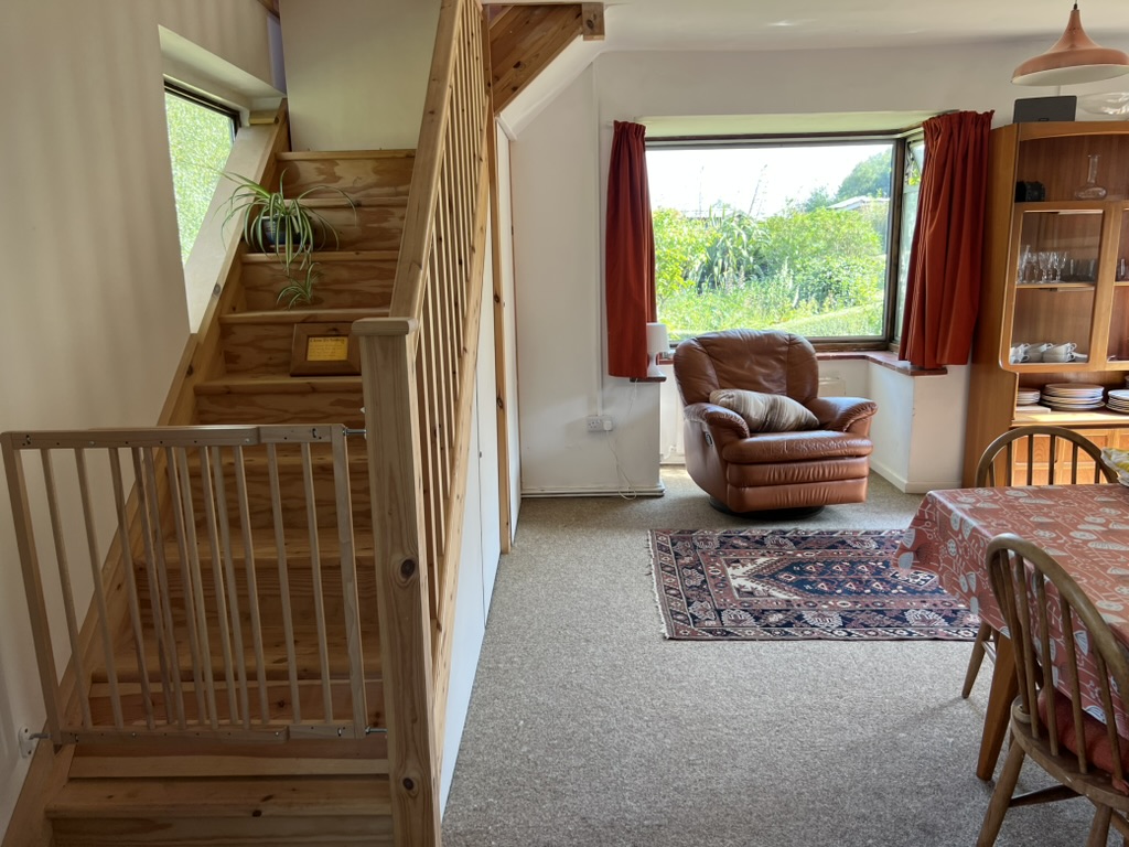 The large open plan living space includes an arch and large kitchen hatch and has many picture windows and sliding doors leading onto the 1.5 acre garden. The sitting room is pine panelled. The unusual hallway is styled on a train coach with spotlights onto pictures and leads to 2 stairs down to the bathroom and extra loo. The very large glazed porch has plants and garden chairs and looks south onto the formal garden. The house has off-road parking for 3 cars, several interesting outbuildings, including a 70s chalet/summer house (in need of some tlc).